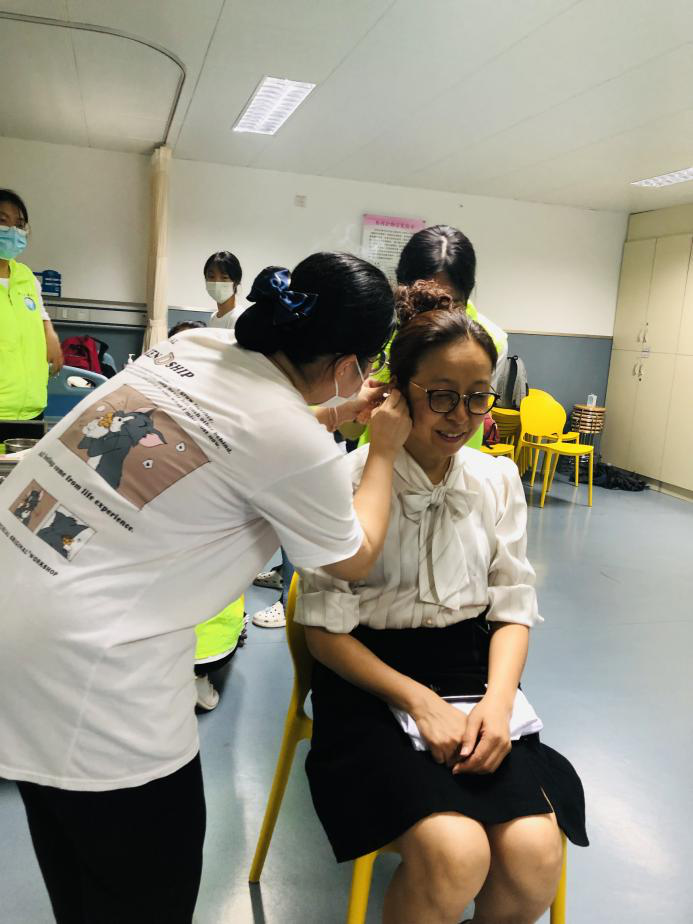 党总支雷丽琼书记听取学生讲解耳穴压豆的知识