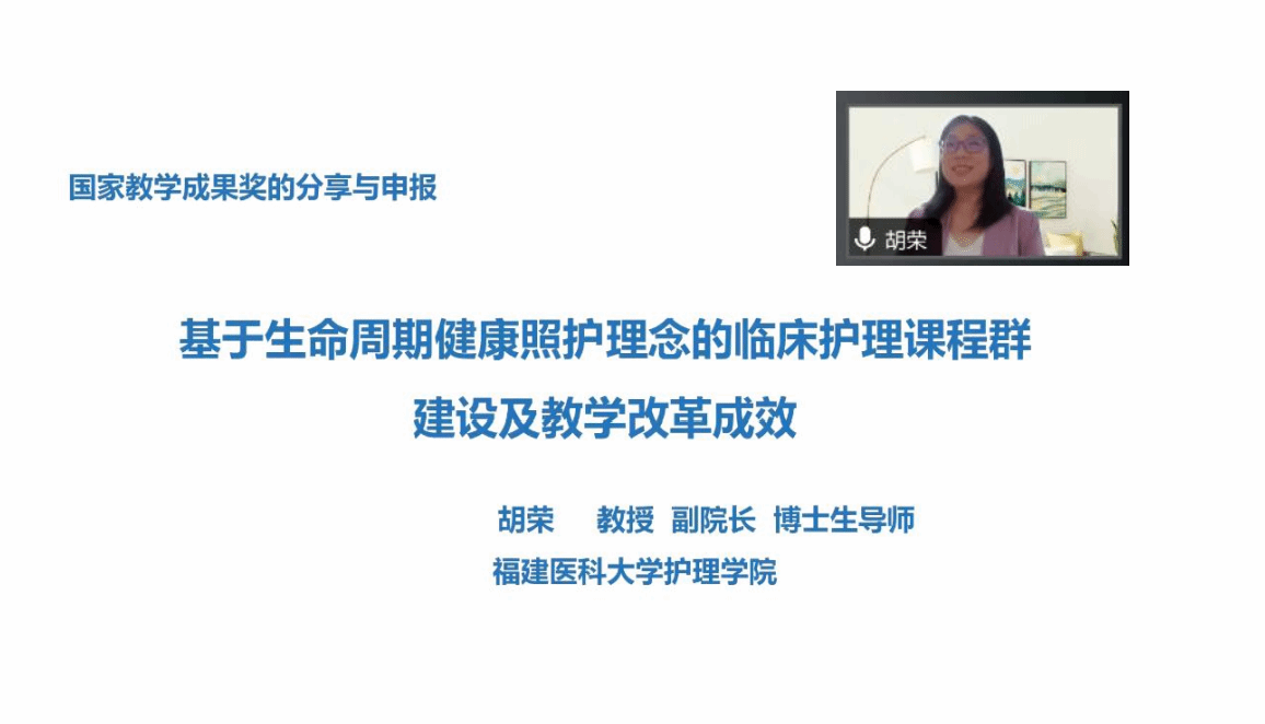 胡荣教授是教育部高等学校护理学专业教学指导委员会委员,福建省护理学会高等教育专委会主任委员。曾获国家教学成果奖二等奖3项,获国家首届高校教师创新教学大赛等5个国家级教学竞赛奖项。被授予福建省课程思政教学名师、福建省“三八红旗手”、福建医科大学“竹兴政旺”基金会优秀青年教师奖、网络名师工作室、十佳教师等。