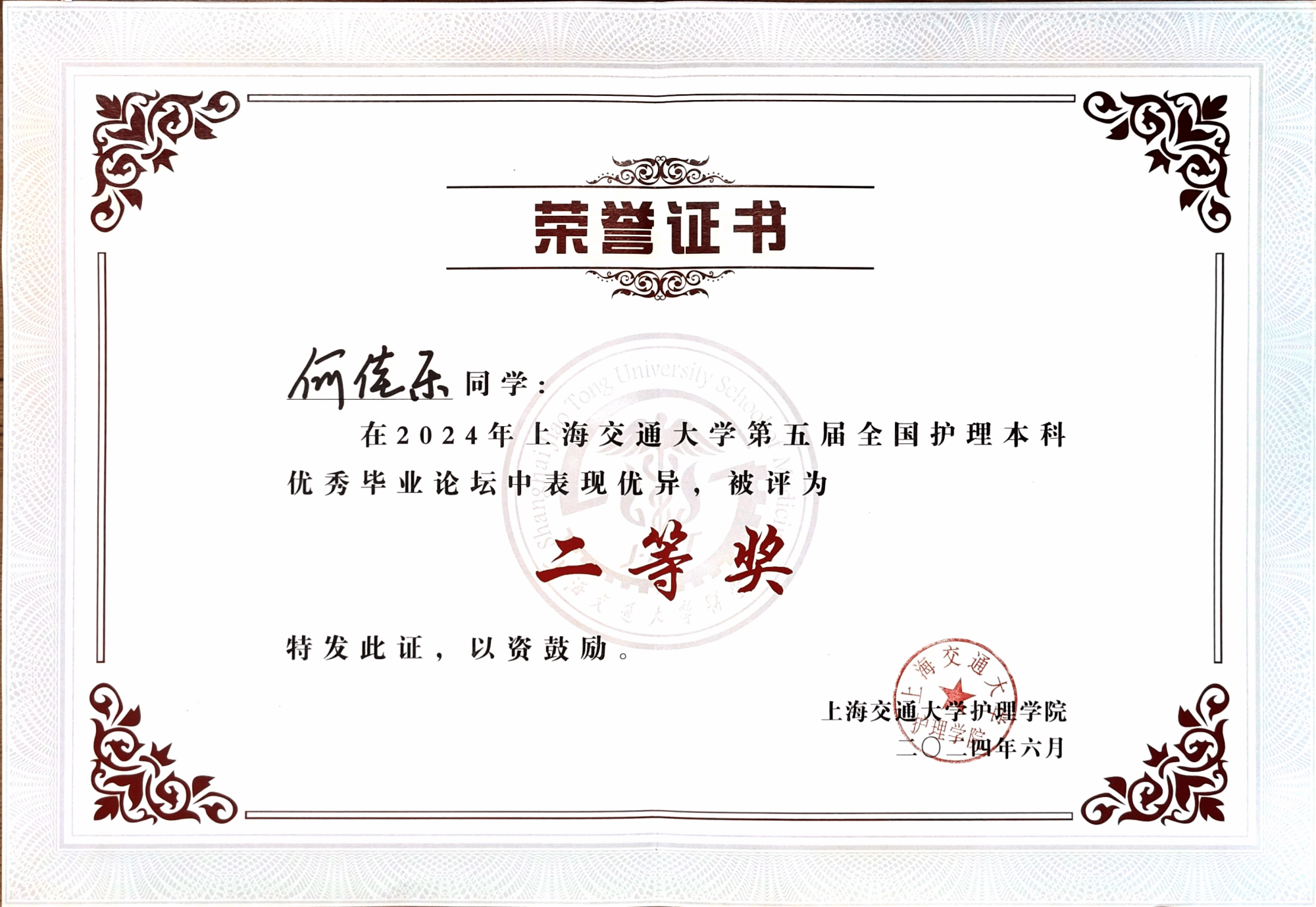 赌博平台2020级护理本科生何佳乐的毕业论文《人际关系对青少年心境障碍住院患者非自杀性自伤的影响》(指导教师:高云副教授)荣获口头汇报二等奖;2020级护理本科生张钰晗的毕业论文《原发性肝癌患者一级亲属癌症风险感知的质性研究》(指导教师:韩媛副教授)荣获优秀壁报奖。