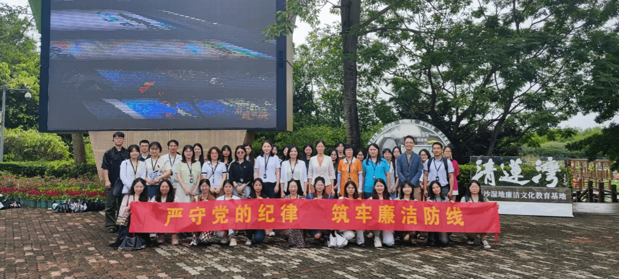 上午,全体师生党员及入党积极分子来到南沙湿地廉洁文化教育基地清莲湾开展党纪学习教育现场教学活动。在讲解员的引导下,大家漫步在廉洁文化思想理念与湿地自然景观融为一体的九曲荷花池,品读清官廉吏故事,赏析廉洁经典诗词。“予独爱莲之出淤泥而不染,濯清涟而不妖,中通外直,不蔓不枝……”,在活动现场,师生们共同吟诵廉洁经典古诗词《爱莲说》,深刻体会诗词中蕴含的廉洁文化思想内涵,让清廉之风润化心灵,筑牢崇廉向善的思想根基。