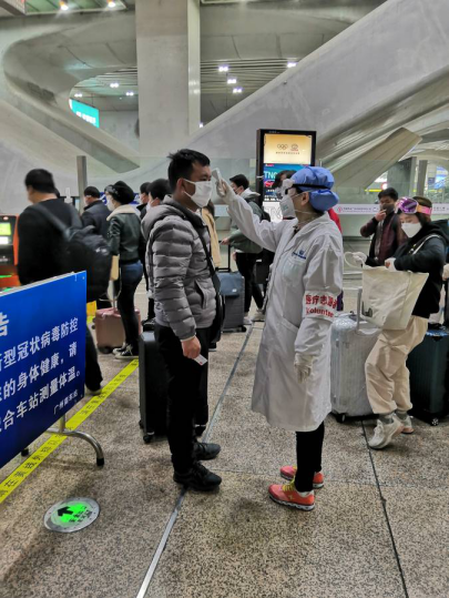 赌博平台2016级护理学专业李慧景同学在广州南站给乘客测量体温