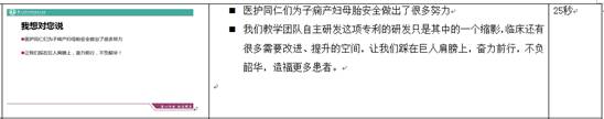 5.融合知识能力素质 《妇产科护理学》是实践性很强的学科,受疫情影响未能开展线下实验及临床见习。为弥补这一缺憾,本教学团队通过疫情期间自主拍摄(如会阴擦洗),前期研发储备(子痫抢救演练视频),网上寻找合适资源(胎心监护操作)三管齐下,让学生看到临床真实情境下的救护流程,并注重培养护生解决复杂问题的实践能力和临床思维,体现高阶性。