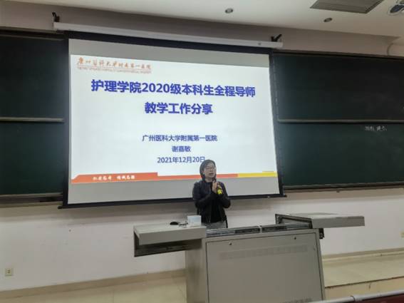 紧接着教研办韩媛主任以《2020版护理学专业本科人才培养方案解读》为题,结合导师任职要求,进一步对我校人才培养目标定位、护理学专业课程计划等作了详细介绍,并结合上一年自己作为导师如何引导学生选课、追踪学生学业成绩的做法,再次强调了本科生导师的工作职责。