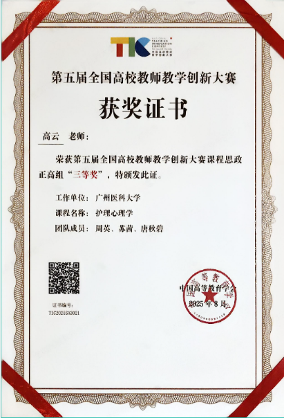 2025年8月16日19日,第五届全国高校教师教学创新大赛在北京举行。赌博平台 高云教授《护理心理学》课程团队,继省赛荣获特等奖后,代表广东赛区参加全国赛并取得佳绩,荣获全国高校教师教学创新大赛课程思政正高组“三等奖”。这也是赌博平台教师连续第二年荣获国家级高水平教学竞赛奖项。