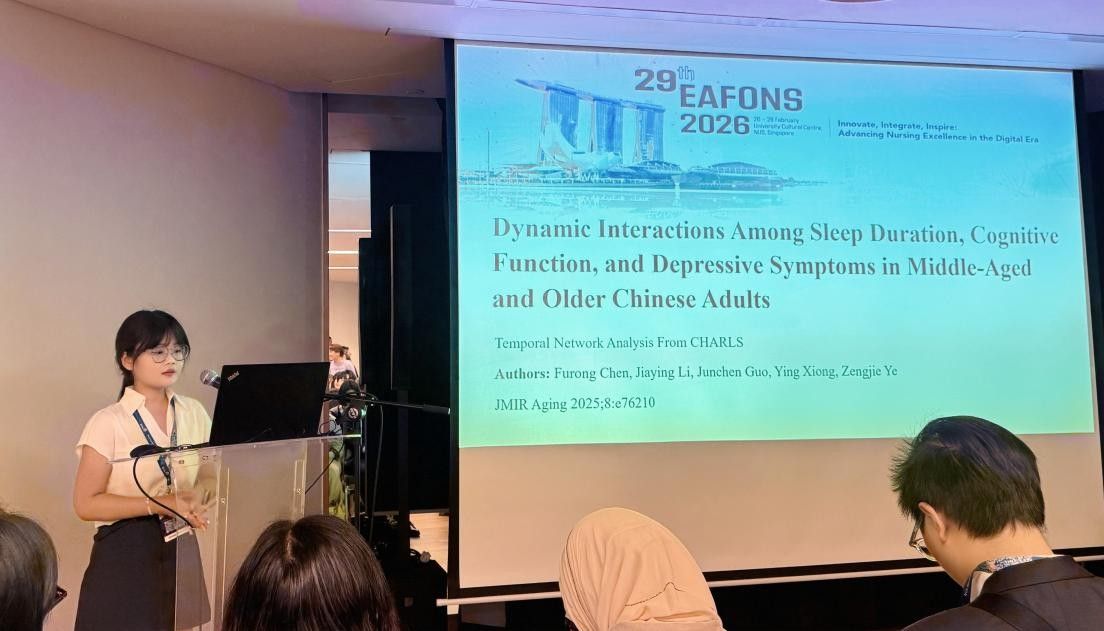 本次论坛中,我校博士生陈付蓉进行了题为 “Dynamic Interactions Among Sleep Duration, Cognitive Function, and Depressive Symptoms in Middle-Aged and Older Chinese Adults: Temporal Network Analysis From CHARLS”的口头报告。该研究基于中国健康与养老追踪调查(CHARLS)纵向数据,对3136名45岁及以上中老年人群进行时序网络分析,揭示了睡眠时长、认知功能与抑郁症状之间的动态关系,为通过改善睡眠和情绪管理以缓解抑郁、延缓认知衰退提供了新的干预思路,受到与会国际学者广泛关注与高度评价。汇报结束后,多位国际学者与陈付蓉展开深入交流,围绕研究设计、数据分析方法等问题进行探讨。陈付蓉表示,这种面对面的学术对话让她获益良多,不仅获得了同行专家的宝贵建议,也为后续研究拓展了思路。