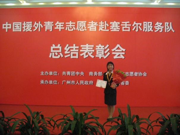 2007年受团中央、商务部及中国青年志愿者协会派遣,援助东非塞舌尔共和国维多利亚医院,期间接受胡锦涛总书记的亲切接见,成功通过塞舌尔共和国护士和助产士的考核,注册成为塞舌尔护士。