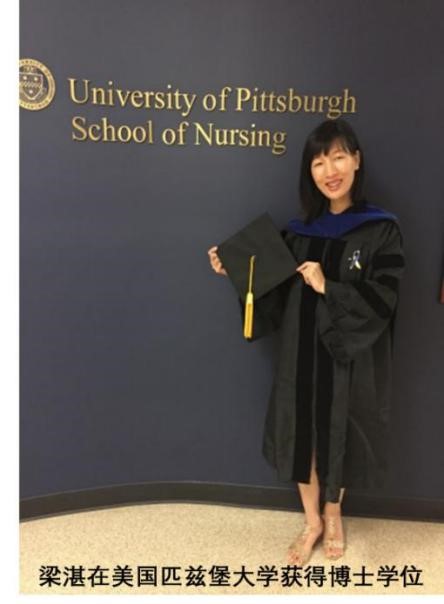 梁湛, 1984年出生,2003年考入我校本科护理学专业,2007年本科毕业、获学士学位,本科毕业后在我校附属第一医院工作一年,此后到澳门大学医院工作。2010年前往美国学习深造,2013年在美国匹兹堡大学获得护理理学硕士学位,2015年获得匹兹堡大学护理哲学博士学位,考取了美国护士执业资格证。现任职于美国佛罗里达州的迈阿密大学护理与健康赌博平台