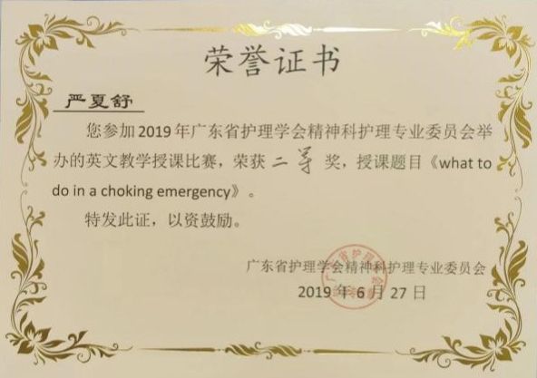 2019年广东省护理学精神科护理专业委员会英文教学授课比赛获奖(左二)